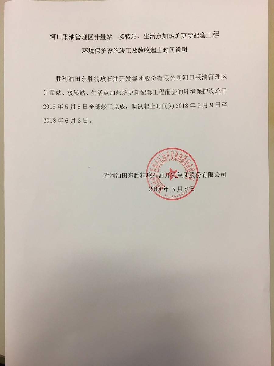 河口采油管理區(qū)計(jì)量站、接轉(zhuǎn)站、生活點(diǎn)加熱爐更新配套工程環(huán)境保護(hù)設(shè)施竣工及驗(yàn)收起止時(shí)間說(shuō)明