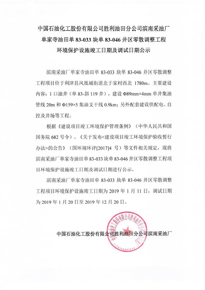 中國石油化工股份有限公司勝利油田分公司濱南采油廠單家寺油田單83-033塊83-046井區(qū)零散調(diào)整工程環(huán)境保護設施竣工日期及調(diào)試日期公示