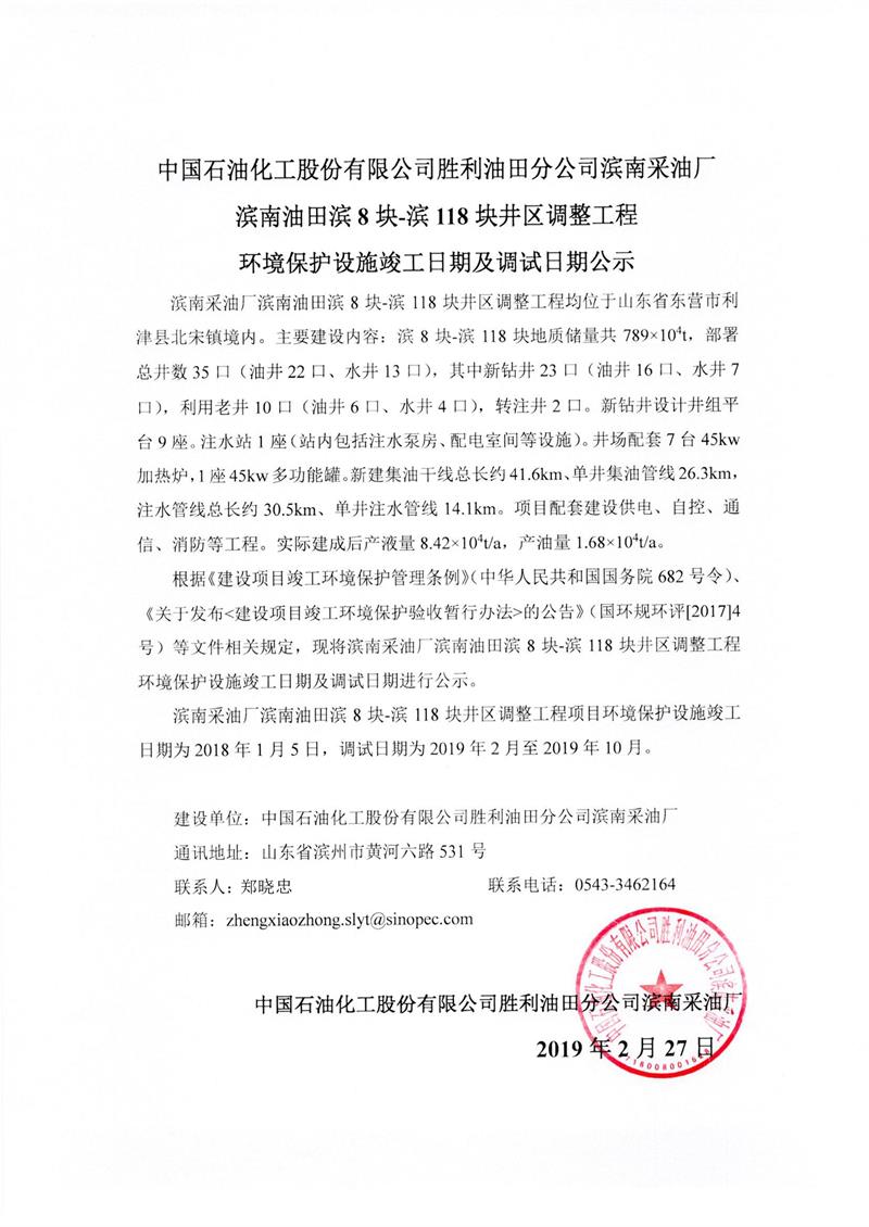 中國石油化工股份有限公司勝利油田分公司濱南采油廠濱8塊-濱118塊井區調整工程環境保護設施竣工日期及調試日期公示