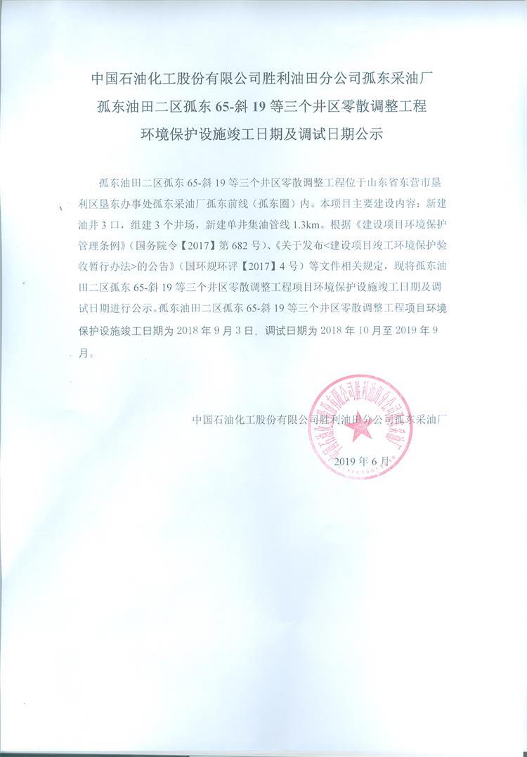中國石油化工股份有限公司勝利油田分公司孤東采油廠孤東油田二區孤東65-斜19等三個井區零散調整工程環境保護設施竣工日期及調試日期公示